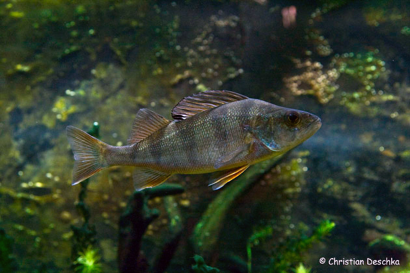 Der Flussbarsch ist an der geteilten Rückenflosse, den rötlichen Bauchflossen und dem seitlichen Streifenmuster (Tarnung in Ufervegetation) erkennbar.