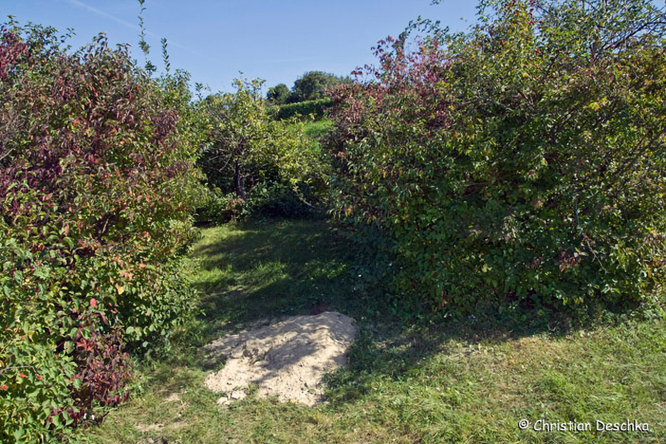 Von diesem Bau sind zwei Ein- bzw. Ausfahrten zu sehen. In der Hecke befinden sich weitere Fluchtröhren.